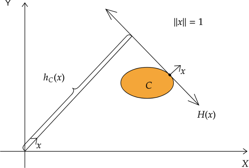 Graphical representation of the support function and supporting hyperplane.