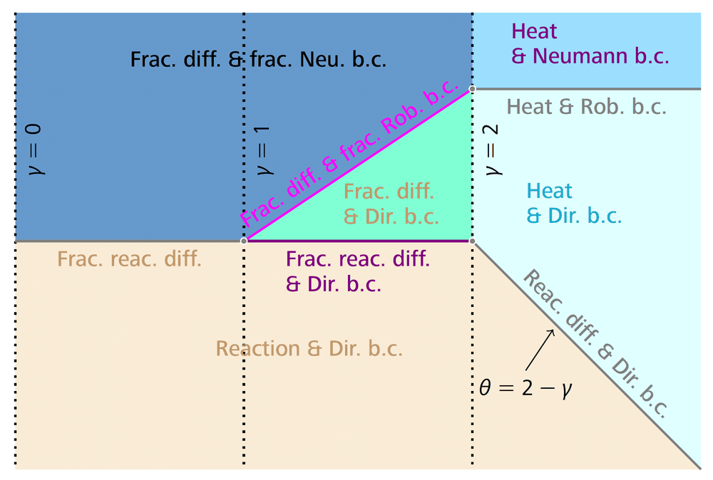 When , the variance is infinite and the system becomes superdiffusive. Consequently, the resulting equation is written in terms of a fractional Laplacian operator rather than the ordinary Laplacian. Since the solutions of the equation are defined on the interval , one deals, in fact, with a regional fractional Laplacian. Now the boundary conditions involve fractional derivatives. For a summary of the regimes where the boundary conditions are shown, see Figure 4.