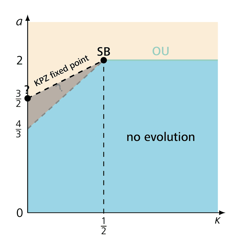 Note that if, in this expression, we take , we get a trivial evolution for the density field. The same is true if instead we redefine the field in a frame with the velocity . Therefore, to get a non-trivial behavior, we have to speed up the time, and for the choice , the limit field is given in terms of the so-called KPZ fixed point, which was constructed in [48 K. Matetski, J. Quastel and D. Remenik, The KPZ fixed point. Acta Math. 227, 115–203 (2021) ]. In [30 P. Gonçalves, Central limit theorem for a tagged particle in asymmetric simple exclusion. Stochastic Process. Appl. 118, 474–502 (2008) ], it was proved that, up to the time scale , there is no evolution of the density field, and its law coincides with the law of the initial field . Nevertheless, beyond that time scale, the limit is not yet known, but it should be given in terms of the KPZ fixed point. The results of [30 P. Gonçalves, Central limit theorem for a tagged particle in asymmetric simple exclusion. Stochastic Process. Appl. 118, 474–502 (2008) ] applied to WASEP show that, below the line , there is no time evolution, but in fact, the trivial evolution should go up to the line ; see the gray region on Figure 7.