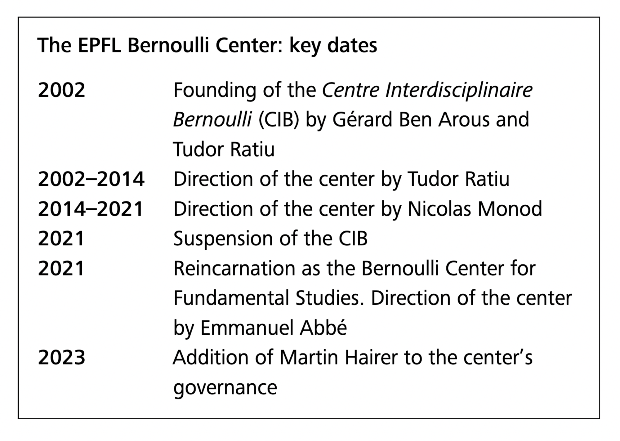 Founded as the Centre Interdisciplinaire Bernoulli (CIB) by Professors Tudor Ratiu and Gérard Ben Arous, the center was born of the desire to bolster the reputation of the engineering-focused school in the theoretical sciences. “The key event that paved the way for the CIB was the fusion of the basic science departments of EPFL and the University of Lausanne. To raise the level of theoretical sciences at EPFL, I had the idea to form a research center focusing on mathematics, physics, and chemistry,” recalls Ben Arous. He then set out to develop a center inspired by the Institut des Hautes Études Scientifiques (IHÉS) in Paris.