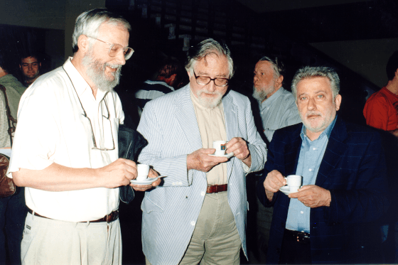F. W. Lawvere, A. Heller, R. Lavendhomme (in the back) and A. Carboni at CT99, Coimbra, Portugal (© M. M. Clementino and J. Picado)