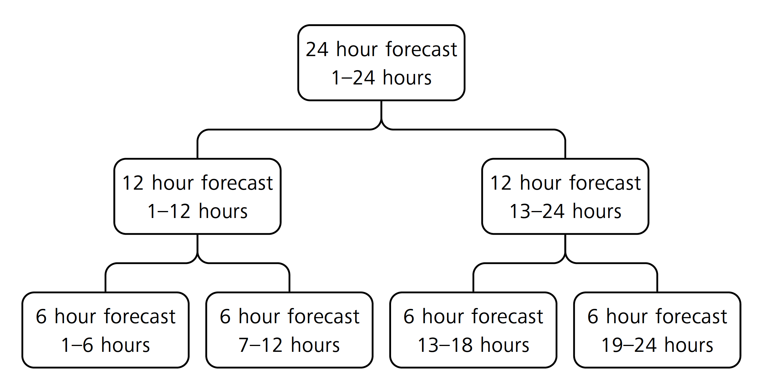 For clarity, the notation in this study uses superscripts for naming or other distinctions and subscripts for indices, so, e.g., is the forecast on the 6-hour resolution 13 to 18 hours ahead.