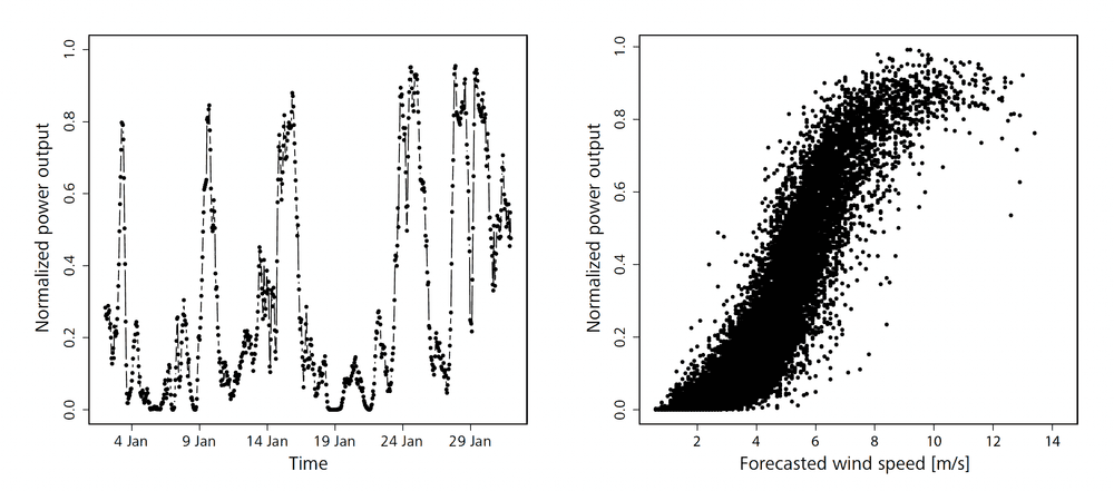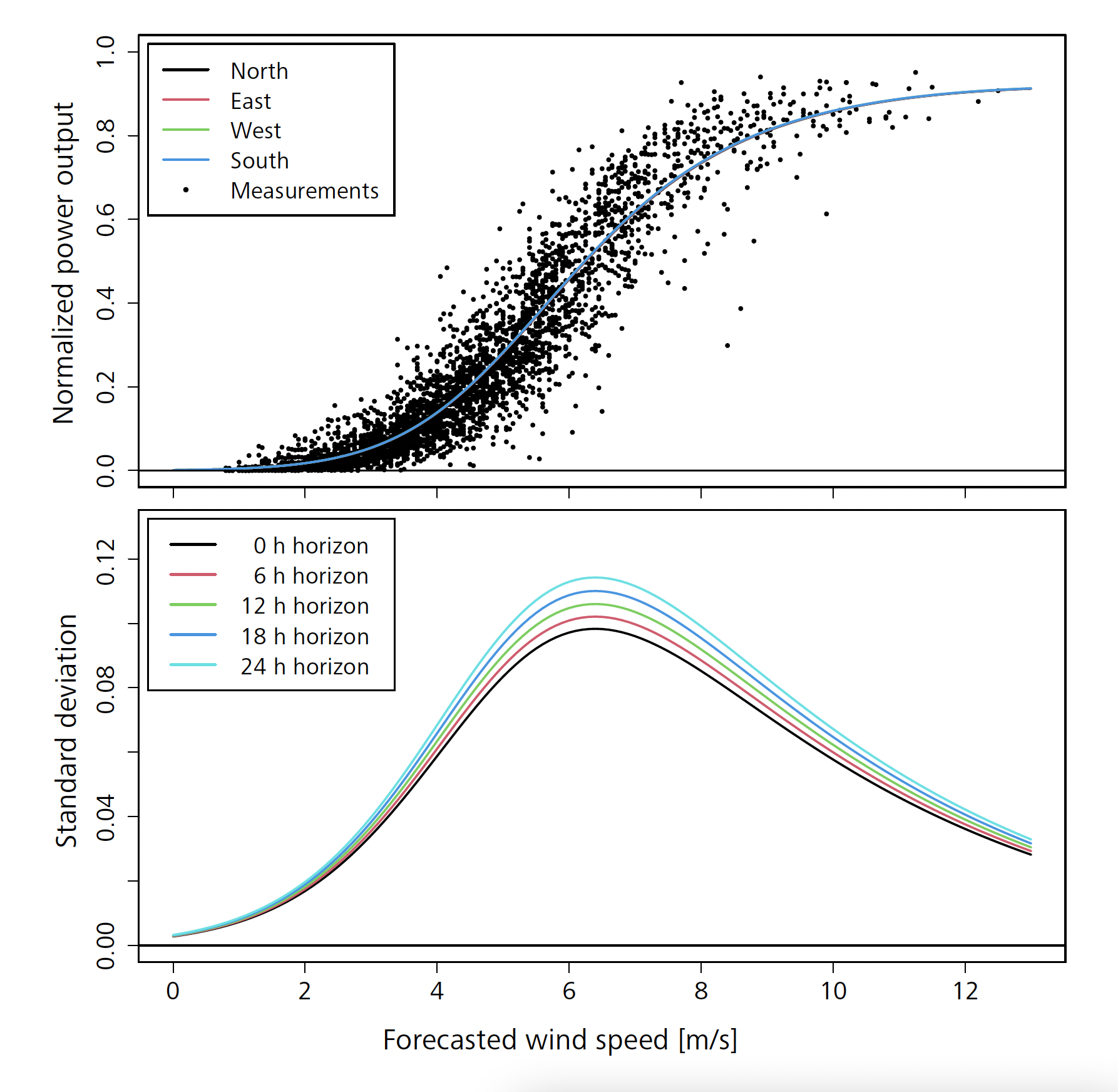 With forecasted weather variables, the uncertainty of the NWP is translated to power by the non-linear power curve. As nicely illustrated by [10 M. Lange, On the uncertainty of wind power predictions – Analysis of the forecast accuracy and statistical distribution of errors. J. Sol. Energ. Eng. 127, 177–184 (2005) ], this explains the form of the standard deviation in Figure 4 (bottom), and this is also in line with what was seen by [12 J. K. Møller, M. Zugno and H. Madsen, Probabilistic forecasts of wind power generation by stochastic differential equation models. J. Forecast. 35, 189–205 (2016) ]. Furthermore, the standard deviation clearly depends on the prediction horizon.