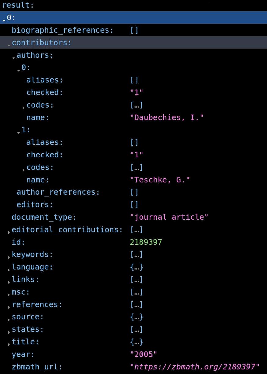The obvious advantages of using such a common protocol are that it is well established, easy to implement, and has a substantial positive impact on working mathematicians. Aggregators, archives, and bibliometric researchers commonly use the OAI-PMH, and there are ready-made client libraries available in every major programming language. Furthermore, this protocol is well suited for harvesting the entire open collection of zbMATH Open document data.2The data made available through the OAI-PMH API is provided under a CC-BY-SA 4.0 license, as are all other data offers by zbMATH Open made through APIs. Legal constraints by publishers that are outside the control of zbMATH Open are currently restricting the amount of data that can be distributed through APIs. Moreover, it is possible to restrict the harvesting process to well-defined subsets, and to only consume updates since the last download, obliterating the need to download all the data every time.