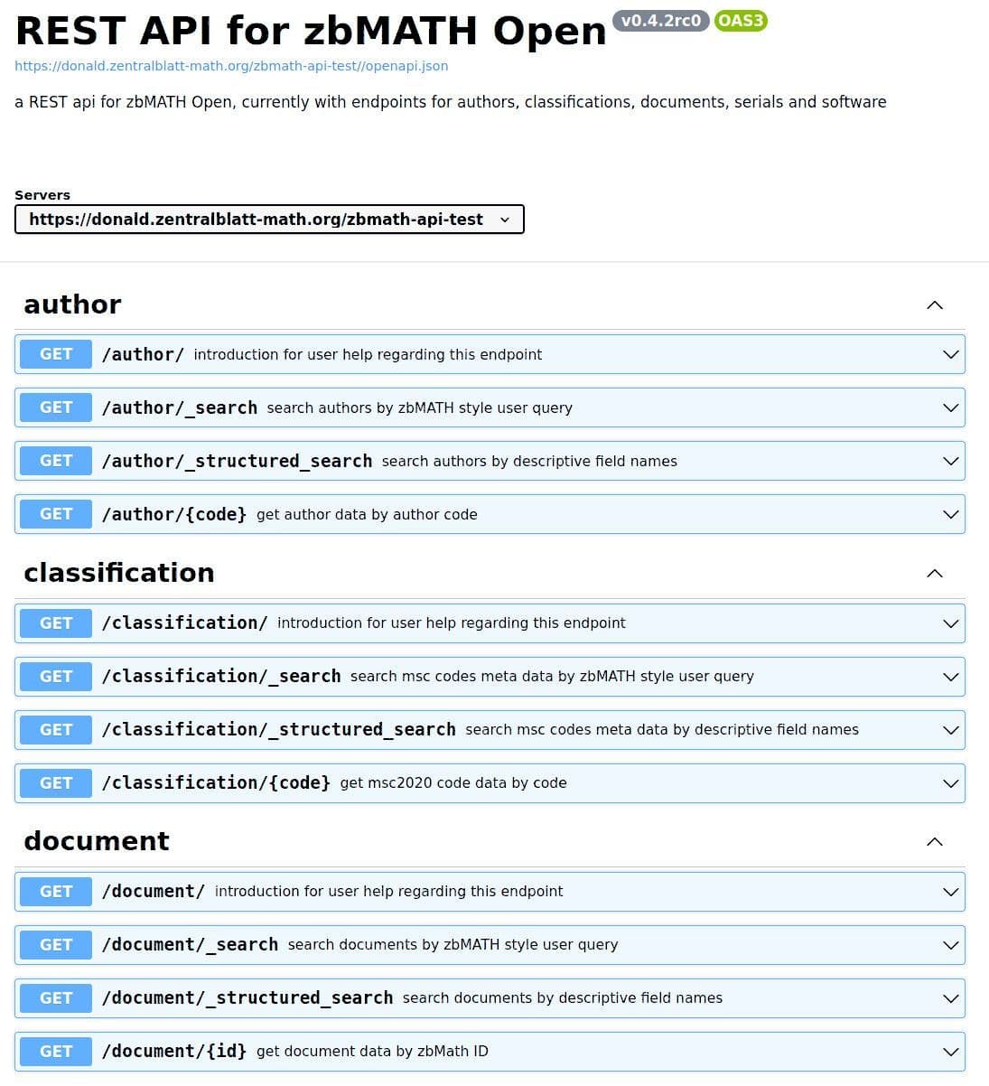 To summarize, the new zbMATH Open REST API will be a useful tool for automated access to the data stored within the zbMATH Open database. It will extend the possibilities currently offered by the OAI-PMH API (without superseding it). With the oncoming features of adding and/or updating information to the database in an automatable way, open access for zbMATH Open data will continue to expand.