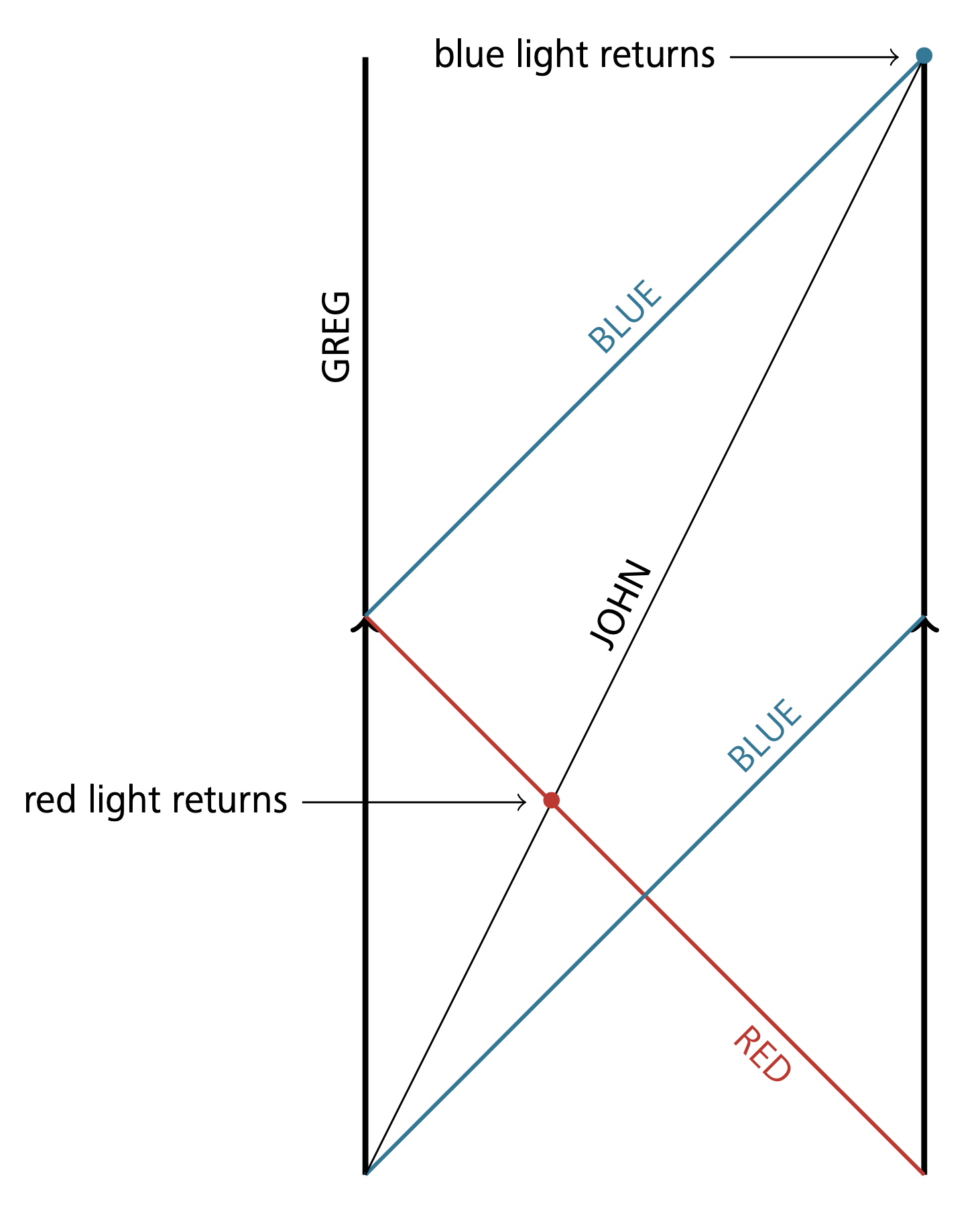 But why is this not a paradox? Again, the problem is that, despite appearances, there is no symmetry in the situation. In other words, there is no global isometry of space-times interchanging their rest frames. Space-time is foliated by a distinguished family of closed space-like geodesic loops. These are orthogonal to Greg’s world-line, but not to John’s. This means that, unlike in Minkowski space-time, John could do an experiment to figure out that he is moving. For example, suppose that Greg sees John moving to the right. If John emits a red light ray leftwards and a blue light ray rightwards, and waits for them to circle around the universe, he will see the red light ray return first; see Figure 2.∎