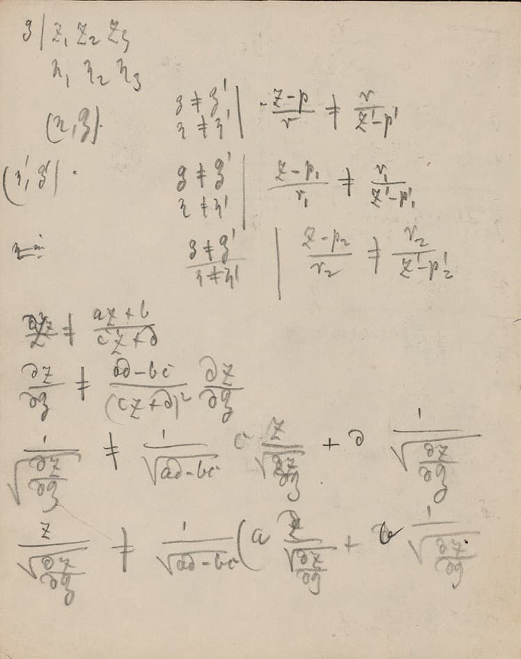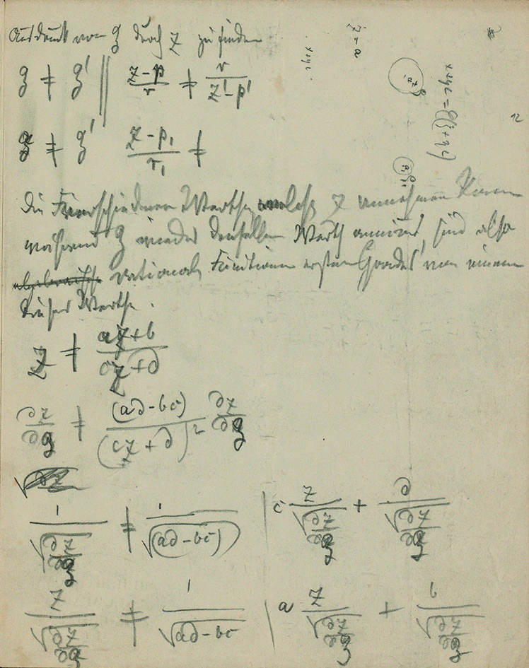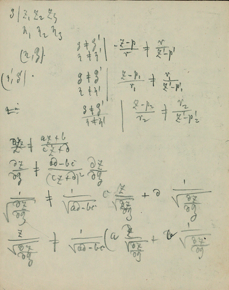 Early in his correspondence with Dedekind, Weber mentioned that he would be “very interested” in being able to “decipher” the manuscripts on “the distribution of electricity on three spheres” [sic], which he hoped to be able to achieve since “on one of the sheets the results seem to be essentially in place” [32 K. Scheel, Der Briefwechsel Richard Dedekind – Heinrich Weber. 5, Abhandlungen der Akademie der Wissenschaften in Hamburg (5), De Gruyter Oldenbourg, Hamburg (2014) , p. 62, letter from March 22, 1875]. As this last remark suggests, Riemann’s manuscripts in Cod. Ms. Riemann 5 contain many sheets with various states of development of his investigation. There are 27 pages by Riemann’s hand, for 4 pages of text by Weber, and certainly the material differences of each mathematician’s handwriting and use of paper do not account for such a large difference. In fact, many of Riemann’s notes contain similar computations, see Figure 2.