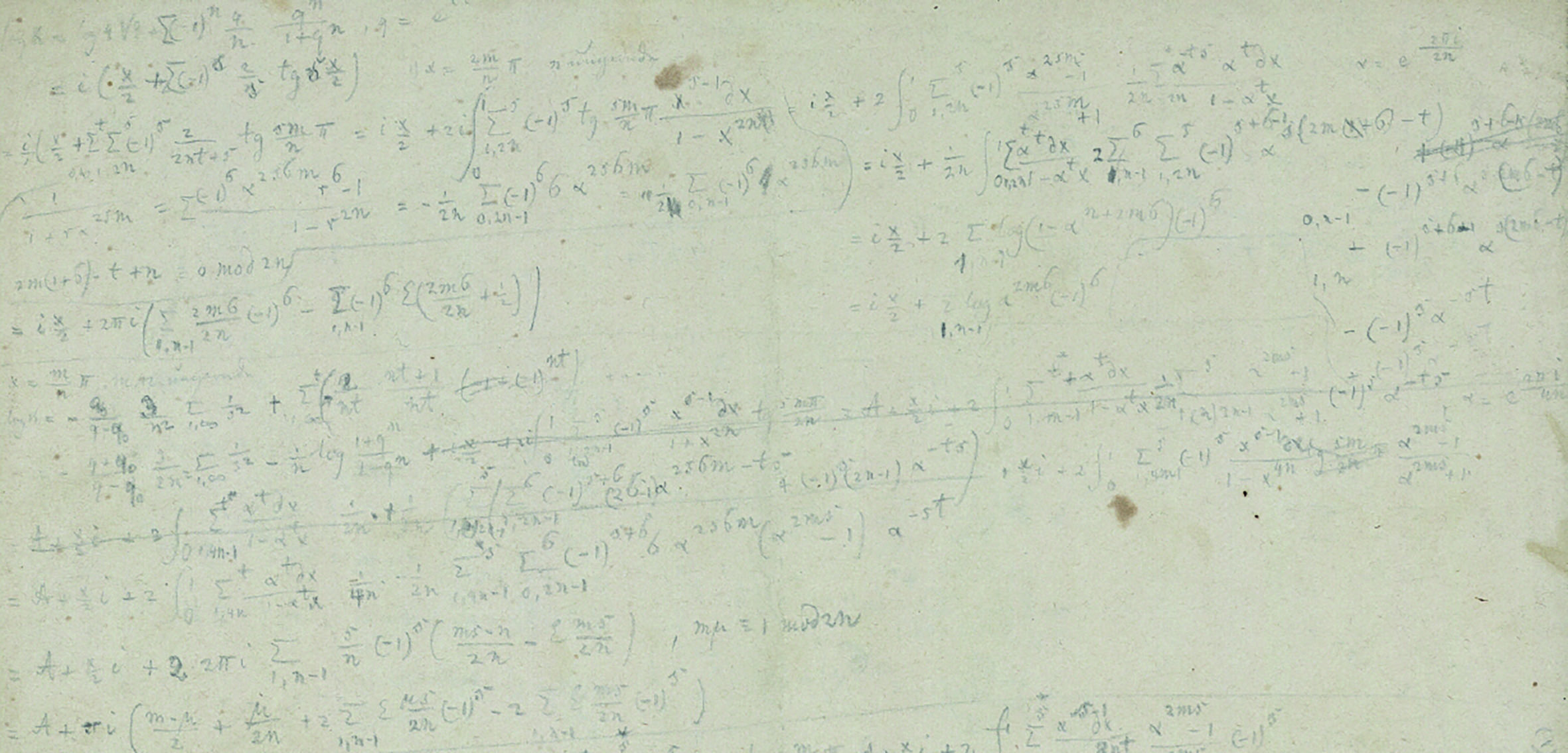 The time of writing of the first of the two fragments (September 1852) makes it likely that Riemann, while working on his memoir On the representation of a function by a trigonometric series, was looking for examples of functions with infinitely many discontinuities in each interval. Perhaps the second investigation, which occurs on the barely legible sheet, has the same object.16[1 J. Arias-De-Reyna, Riemann’s Fragment on Limit Values of Elliptic Modular Functions. Ramanujan J.8, 57–123 (2004) ] disagrees with this interpretation. Hopefully, the manuscripts hold some elements to answer this question. [4 R. Dedekind, Erläuterungen zu den vorstehenden Fragmenten. In [25], 1st ed. (1876) 438–448, 2nd ed. (1892), 466–479; transl. En., 461–474. First published in 1876 , p. 438]