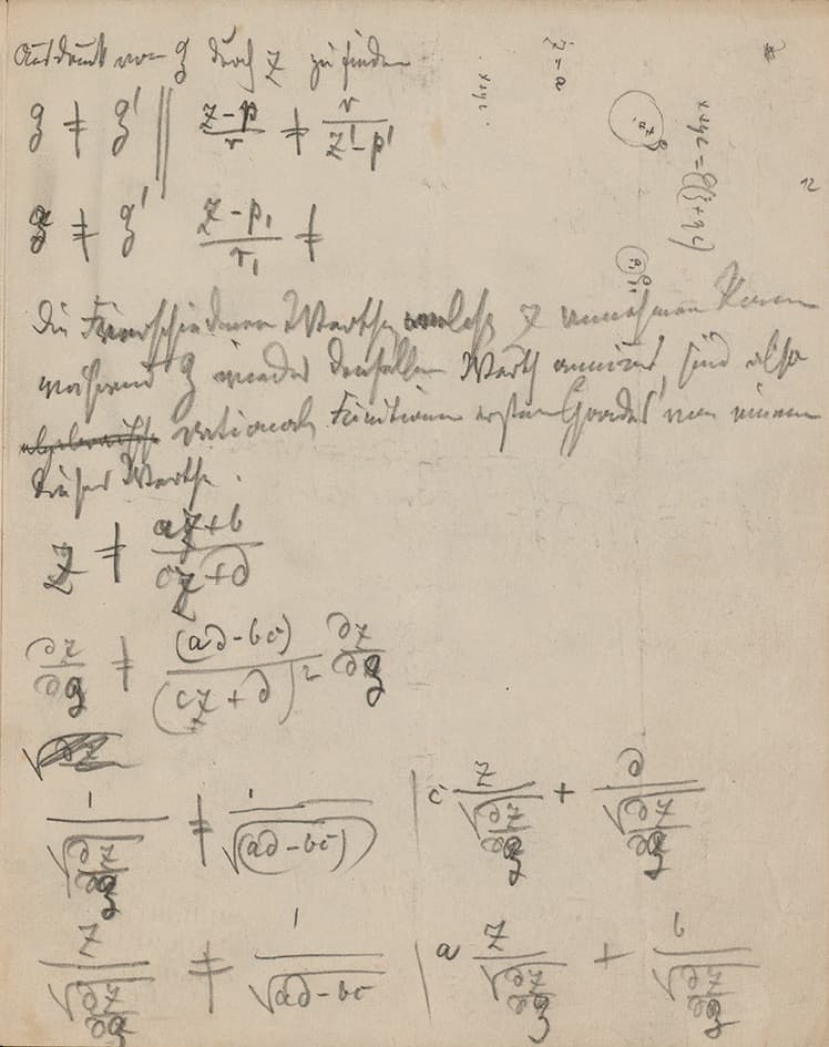 The most exceptional documents can be found in Dedekind’s archive. In Cod. Ms. Dedekind XI 11-1, XI 11-2, XII 4,17Cod. Ms. Dedekind XII 4 is mistakenly listed as referring to [23 B. Riemann, Beispiele von Flächen kleinsten Inhalts bei gegebener Begrenzung. In [25], 417–426. First published in 1876 ] in the Göttingen catalog, because Dedekind refers to the text using the numbering in the table of contents in the 1892 reedition of Riemann’s collected works. The contents of the file are, however, undoubtedly related to [17 B. Riemann, Fragmente über die Grenzfälle der elliptischen Modulfunctionen. In [25], 1st ed. (1876), 427–438; 2nd ed. (1892), 455–465; transl. En., 445–460. First published in 1852 ]. In exploring these documents, I have greatly benefited from Walter Strobl’s help. we find several hundred pages of notes written solely by Dedekind. There, we see the progression in his understanding of Riemann’s texts and of the writing of his 1876 and 1892 commentaries, as well as continuations of his research on the subject. These pages show the breadth and depth of the mathematical reflections developed by Dedekind for his editorial work. In addition to computations following Riemann’s manuscripts and trying to obtain again Riemann’s results, Dedekind developed his own approach to the subject, which ended up being his only way to verify Riemann’s results. For this, he drew comparisons between both approaches, at some points relying only on the correspondences between numerical examples, and eventually systematically exploring the correspondences between his and Riemann’s results. This research was also the basis for his commentaries, of which we find several drafts in the archive. Both Dedekind’s commentaries, although entitled “Explanation on the preceding fragments” do not actually explain what Riemann was trying to do, rather they present: