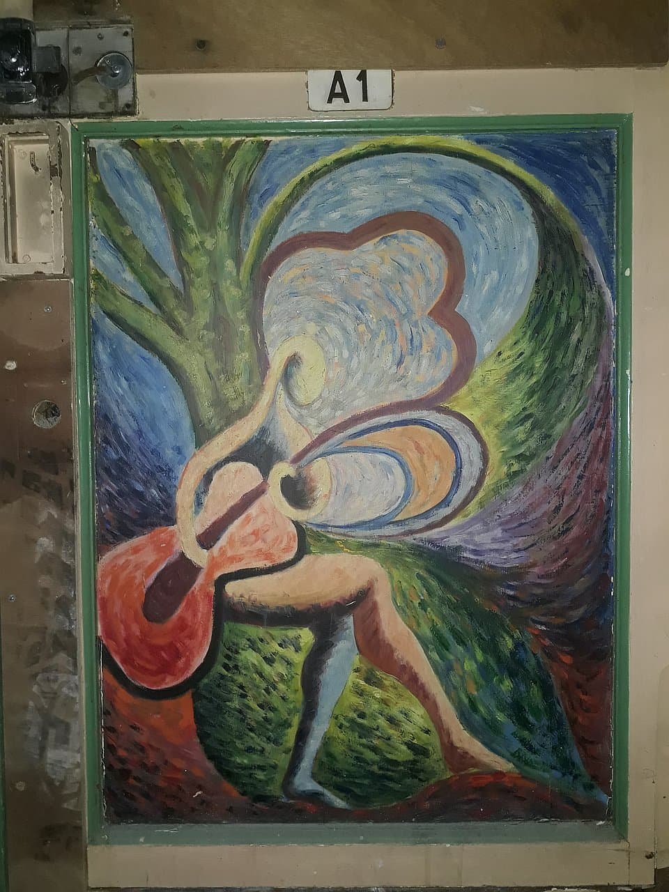 As an anecdote, another view that is lost forever is the painting (Figure 12) I discovered on a basement door in December 2019, after the building was cleaned from radioactivity, asbestos, lead, etc. Even though it was not a Monet, I liked this greeting left by former occupants even though we were not able to keep it. We were able to preserve another piece of art though: a painting of Émile René Ménard (1862–1930) dated from 1927. It spans over several meters on the rear wall of Perrin’s lecture hall, illustrating and surrounded by the first words of his bestseller book “Les atomes.”
