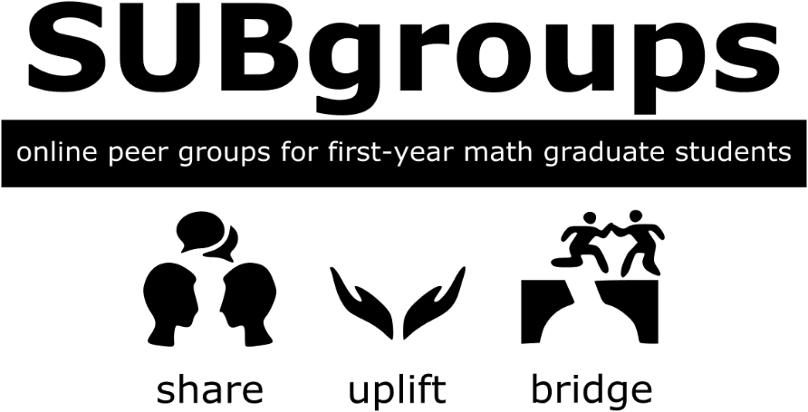 The beginning of graduate school can be an isolating, confusing, and overwhelming experience. SUBgroups are online peer support groups that bring together first-year math graduate students, primarily from U.S. institutions. Participants meet biweekly over video conferencing platforms during the first semester of their master’s or PhD programs. Established in 2019 and running two cohorts per year, SUBgroups has now supported hundreds of students to navigate these first difficult months.
