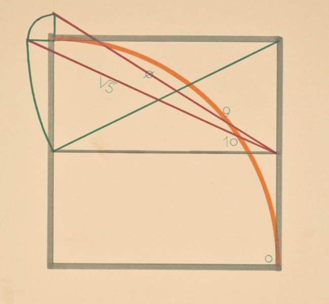 Both drawings can be regarded as protocols for geometric constructions, both starting with a square divided in two equal parts by a horizontal line, with an inscribed quarter circle. The construction in Figure 2 leads to two red lines, marked and , indicating that these lines are diagonals of rectangles with those proportions, and sides parallel to the sides of the square.