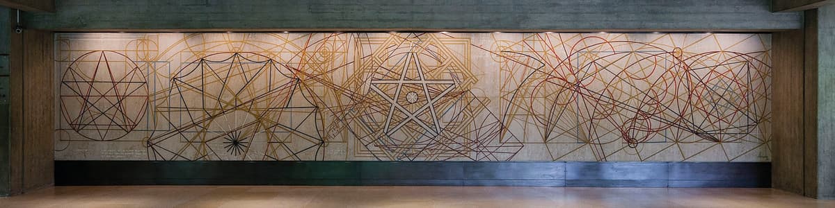 The mural is usually divided into five parts. The first one displays the pentagram with the construction presented in Figure 4 as the main motif. Then, we find a 16-point star, which is an allusion to a drawing by Leonardo da Vinci appearing (apparently by mistake) in Geneva’s codex of Luca Pacioli’s Divina Proportione. The central element is again a pentagram, which Almada associates to a coin, minted by Portugal’s first king, which is set in the midst of many other constructions that Almada used to study some 15th century Portuguese paintings. The right part of the mural presents references to the Minoan civilization and to a medieval poem associated with a guild of cathedral stonemasons. There is a virtual guided tour at gulbenkian.pt/almada-comecar/en/ where the reader can find more detailed information about this mural. However, what we wish to point out with these brief remarks is that Almada’s geometry is truly an effort to unite all art and all cultures.
