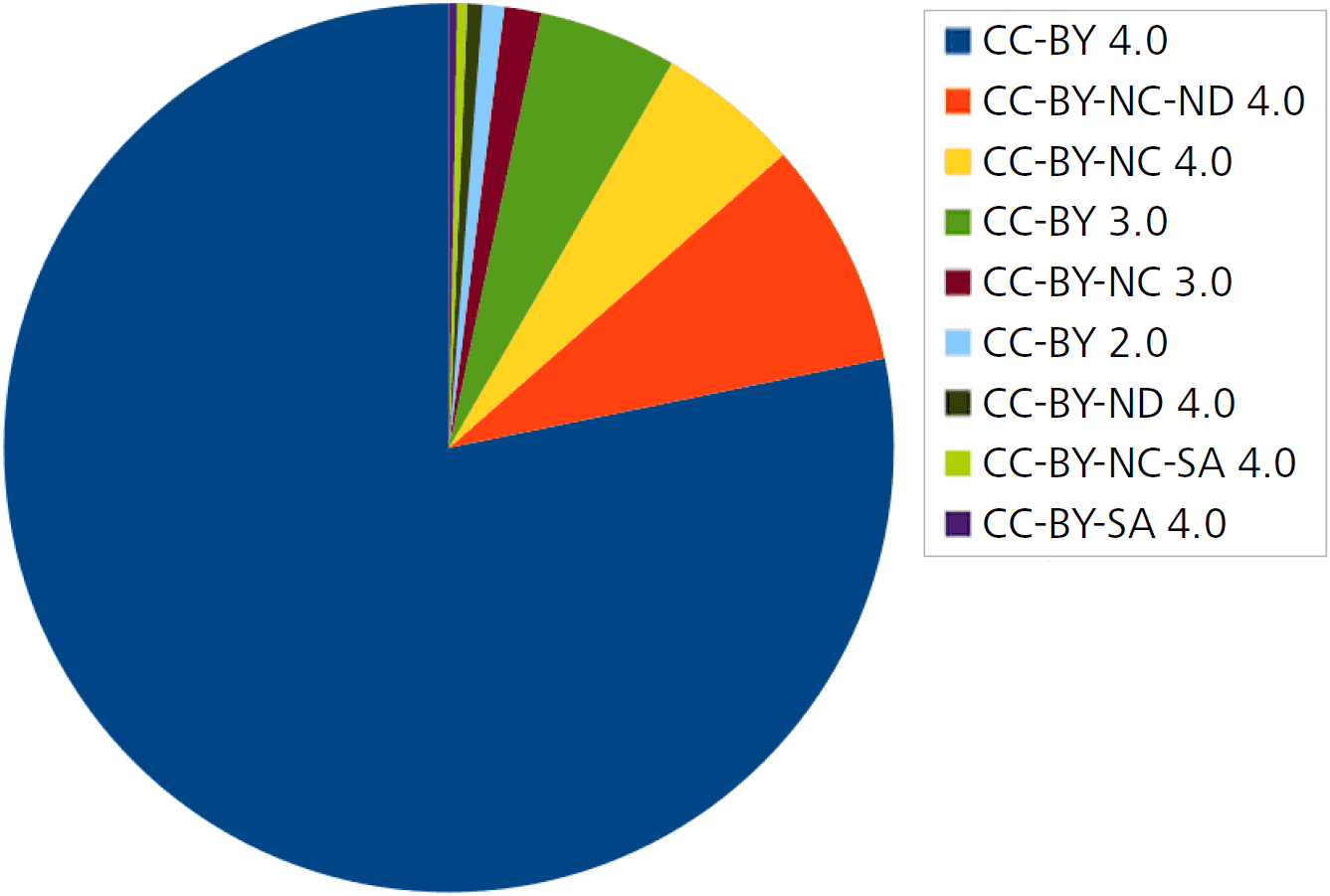 Moreover, it becomes increasingly important that publications are not just openly accessible but come along with an open licence such as CC-BY3Creative Commons Attribution 4.0 International Licence, https://creativecommons.org/licenses/by/4.0/.. The licence situation is also quite diverse – e.g., older arXiv submissions generally come just with a non-exclusive distribution licence, while broader CC licences are more frequently available for recent documents. Hence, a lot of effort has been made to collect both OA and licence data in zbMATH Open, enabling document level information.