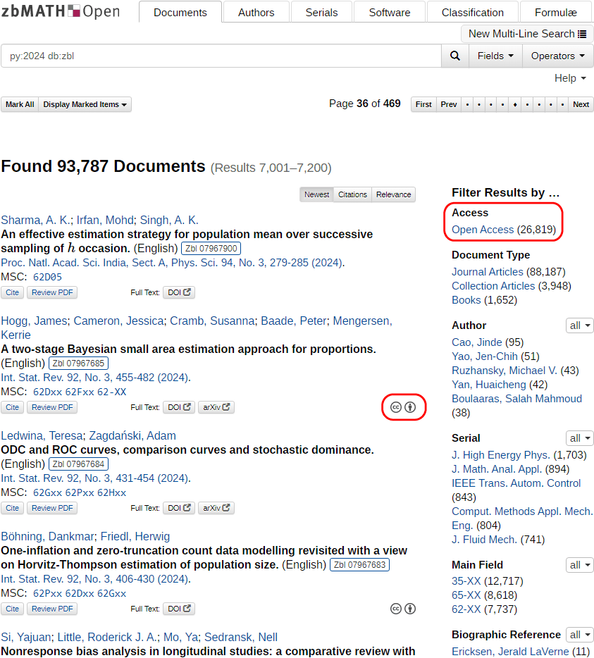 The results are retrievable using the “open access” search and filter option in zbMATH Open. Additionally, an open licence information is displayed if available. This will look as follows: