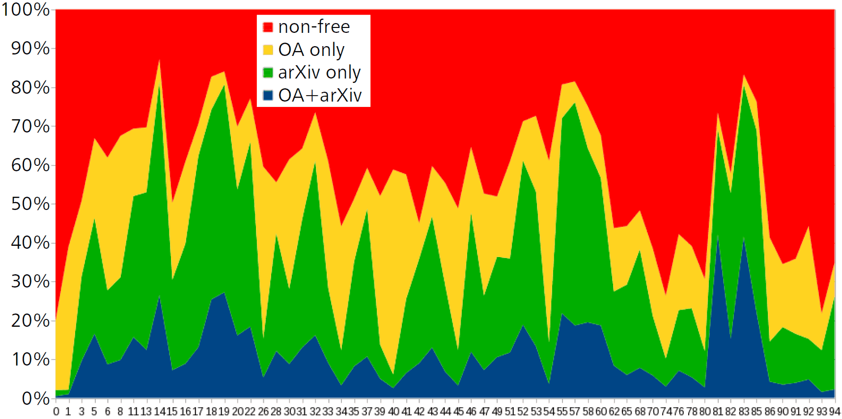The first observation is that only quite recently (in fact, since 2021) the share of free documents surpassed the 50% mark. While this had been achieved in several core areas of mathematics by arXiv coverage alone for some years (see [3 F. Müller and O. Teschke, Will all mathematics be on the arXiv (soon)? Eur. Math. Soc. Newsl. 99, 55–57 (2016) , 4 F. Müller and O. Teschke, Progress of self-archiving within the DML corpus, with a view toward community dynamics. In Intelligent Computer Mathematics, Lecture Notes in Comput. Sci. 9791, pp. 63–74, Springer, Cham (2016) ]), this figure indicates that OA policies have been adopted also by mathematical fields that were less present at the arXiv before.