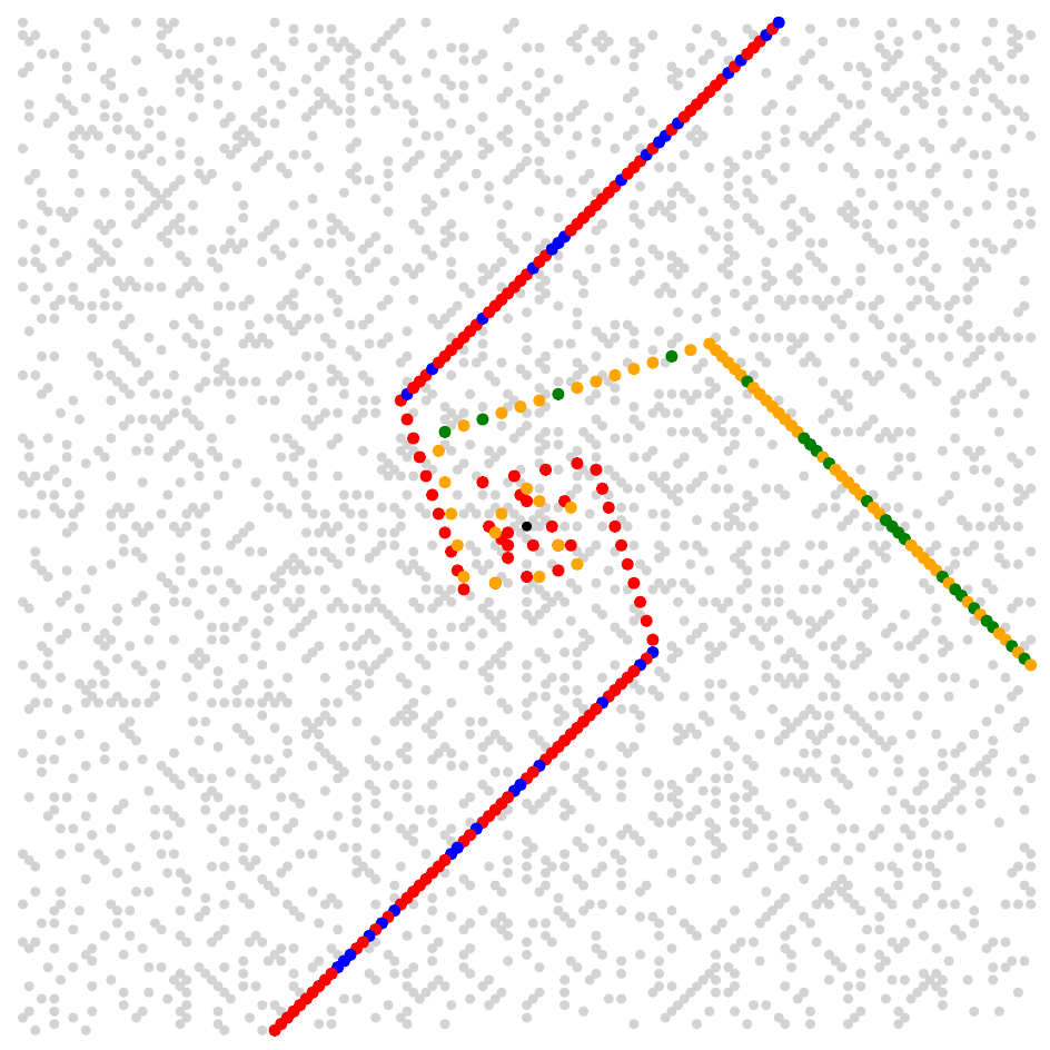 We therefore see in Figure 7 alignments of prime numbers in directions parallel to the diagonals, produced by the quadratic forms (1) and (2), which according to [17 M. L. Stein, S. M. Ulam and M. B. Wells, A visual display of some properties of the distribution of primes. Amer. Math. Monthly 71, 516–520 (1964) ] take many prime values at integers, up to . To find out whether this phenomenon persists beyond this value, when the size of the spiral is further increased, we need to look at the asymptotic behavior of these polynomials.