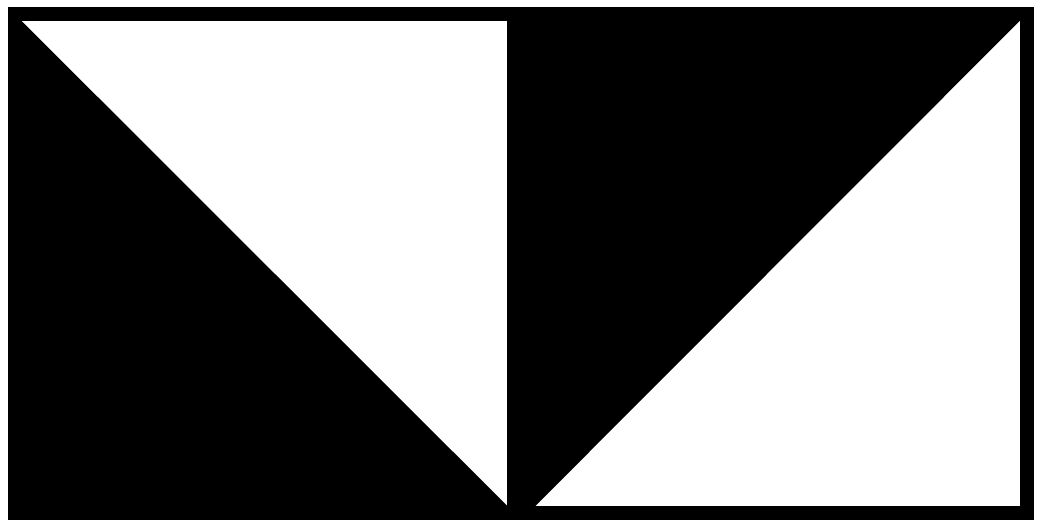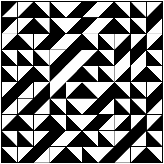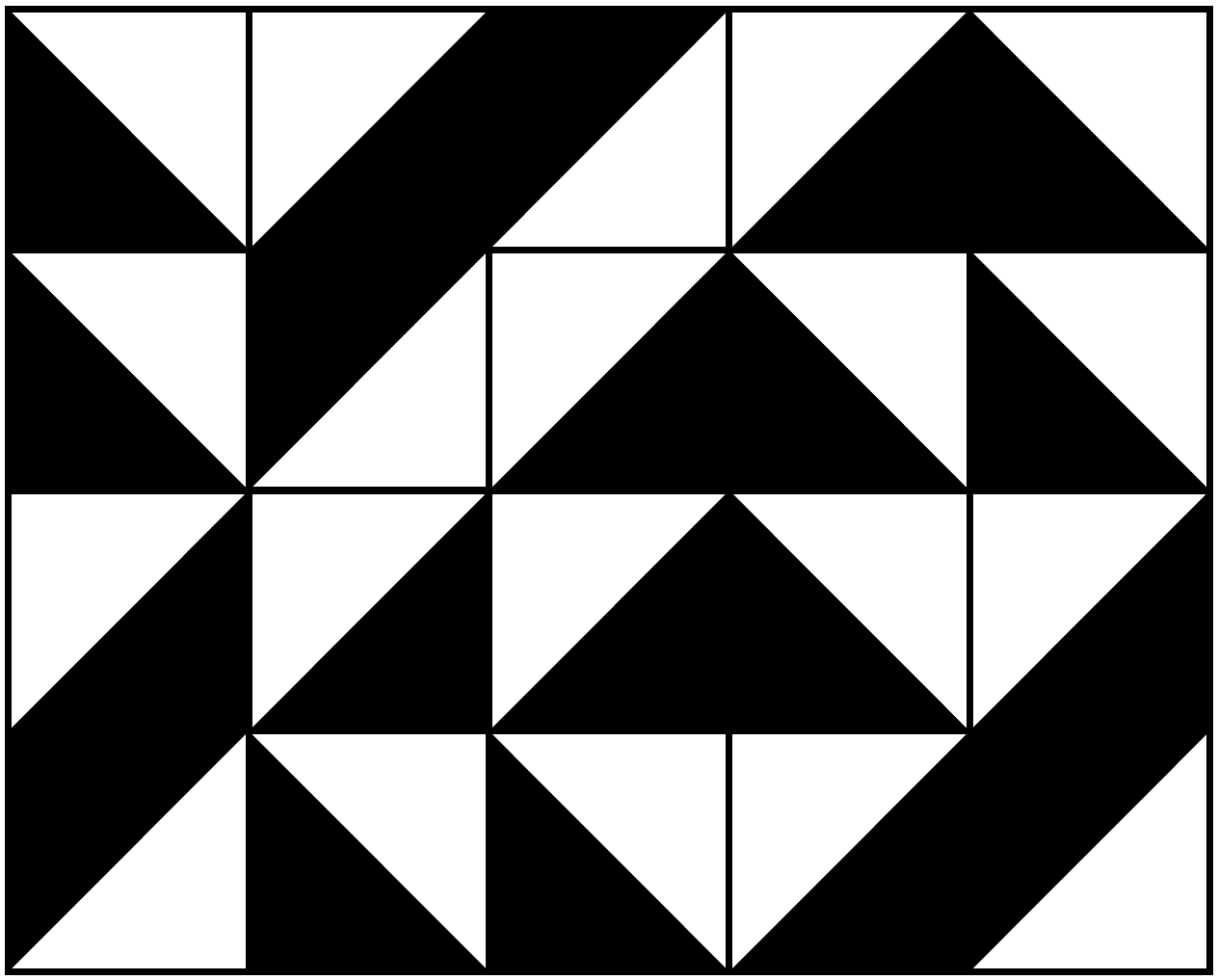 The first mathematical ingredient in the series Transitions, the Truchet tile, is itself at the crossroads of science and art, as we shall see. It takes us back to an important milestone in the development of combinatorics, when Father Sébastien Truchet (1657–1729), mathematician, typographer, “clockmaker, great canal specialist, inventor of countless machines (cannons, tree-transplanting machines, sundials, etc.) including the famous mechanical tables of Marly” [1 J. André, De Pacioli à Truchet: trois siècles de géométrie pour les caractères. In 4000 ans d’histoire des mathématiques: les mathématiques dans la longue durée. IREM de Rennes, Rennes, France (2002) https://bibnum.publimath.fr/IWH/IWH02004.pdf], became interested in the different relative positions of two squares, both divided into two colors: given two identical squares, split in two along the diagonal, with one half white and the other black (see Figure 2), in how many ways can they be arranged in relation to each other?