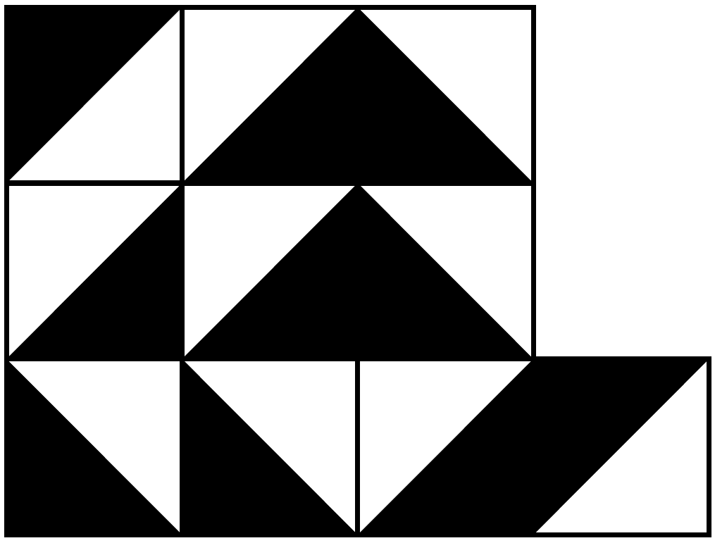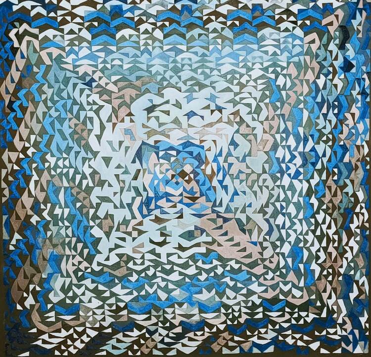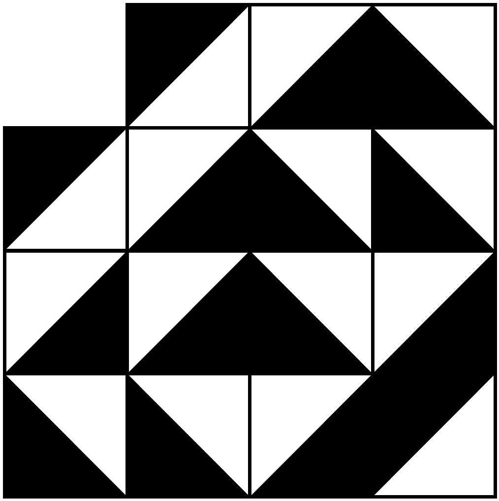 In other paintings, Truchet tiles are replaced by “Pythagorean” rectangles cut diagonally into two triangles of sides , wound into a spiral in the same way as before. The first consequence is that the canvases are no longer necessarily square, which was almost always the case before, as a matter of construction; the second is that the lines delimiting the spiral are less blended into the overall motif, revealing more of the painting’s structure. Finally, the elongated triangles give rise to smoother, more fluid shapes than Truchet’s tiles. Of course, the artist also played with mixing “Greek” tiles with Truchet’s, or even with squares cut into four triangles along the diagonals – there are countless combination possibilities… An example is shown in Figure 13.
