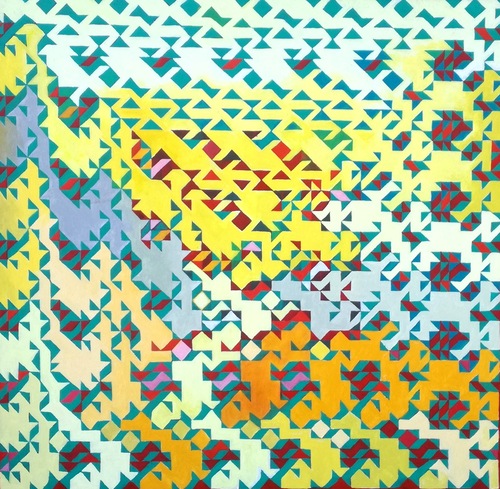 Precision. Long an adept of fast painting, where brushstrokes amalgamate colors into rich, vibrant textures with slightly blurred outlines, Reg Alcorn adopted a different way of painting for the Transitions series: slow, precise work, very sharp contours, which he had previously experimented with in geometrically patterned canvases inspired in particular by Penrose tilings.