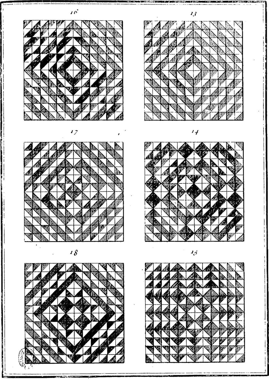 - D. Doüat, Méthode pour faire une infinité de desseins différens, avec des carreaux mi-partis de deux couleurs par une ligne diagonale. Jacques Quillau, Imprimeur Juré de l’Université, Paris (1722) https://gallica.bnf.fr/ark:/12148/bpt6k5823204r