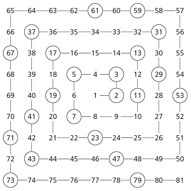 Now we come to our second mathematical ingredient. Creativity from boredom. According to Martin Gardner,11American writer (1914–2010), great popularizer of mathematics. who tells the story in an article for the popular science magazine Scientific American [11 M. Gardner, Mathematical games: The remarkable lore of the prime numbers. Scientific American 210.3 120–130 (1964) ], the mathematician Stanislaw Ulam, bored while attending a conference in the autumn of 1963, began to draw a grid on a sheet of paper to represent a chessboard; changing his mind, he began to number the intersections starting from the center of the grid and spiraling around it in an anti-clockwise direction; then he began to circle the prime numbers and, to his great surprise, saw lines forming along the diagonals (Figure 5).