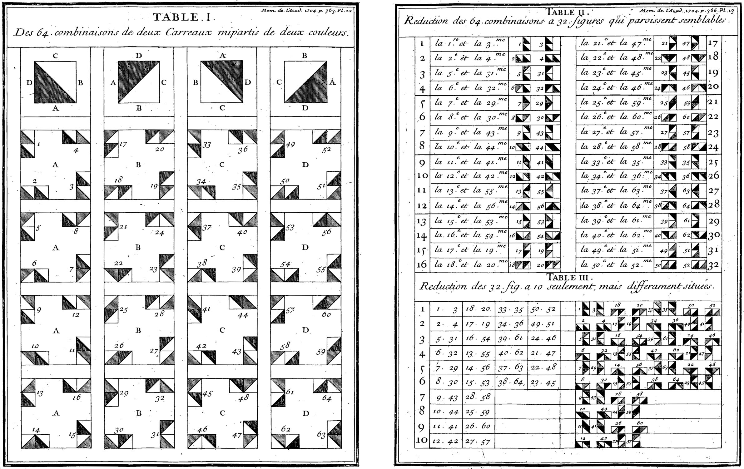 Combinatorics and tessellations. Before presenting his answer, let us note that Truchet’s aim is to study ornamental pavings that can be made from this tile (he proposes a selection of them in his dissertation). This is indeed the motivation he himself gives for his study, by way of an introduction to his Mémoire [18 S. Truchet, Mémoire sur les combinaisons. In Mémoires de mathématique et de physique tirés des registres de l’Académie Royale des Sciences, pp. 363–372, Paris (1704) https://gallica.bnf.fr/ark:/12148/bpt6k3486m/f517, p. 363]: