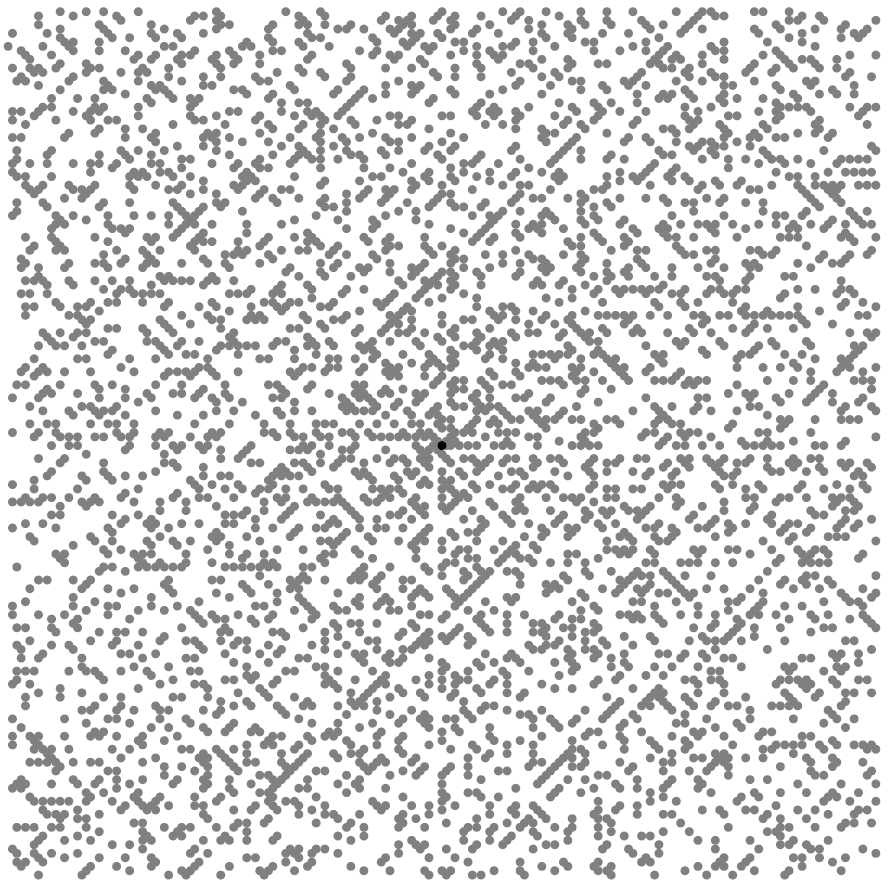 As Gardner points out, this fact is not very significant for a small spiral, insofar as all the integers belonging to a line of diagonal direction have the same parity, all the primes (except one12Or rather except two!) are odd and the density of primes is high among the smallest integers. So in the spiral shown in Figure 5, the 21 odd primes are distributed among just 41 possible positions, forming lines parallel to the diagonals…