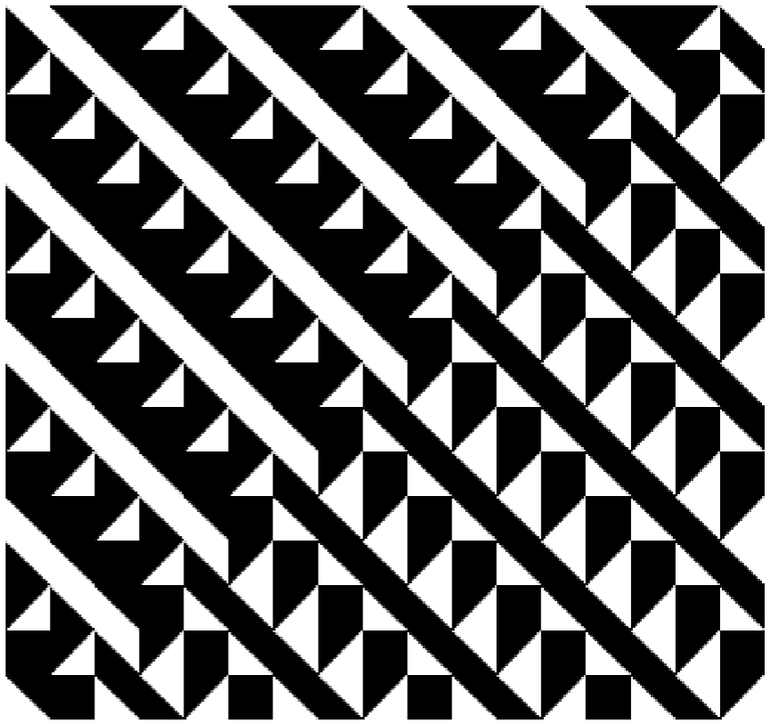 We realize immediately that the very simple process we have implemented quickly produces complex, unpredictable patterns, even though they are determined by the sequence chosen at the outset and, in particular, are highly dependent on its length. For example, it can be seen in Figure 11 that sequences with lengths in multiples of four produce much more regular patterns than the example of length five chosen above, notably because the numbers belonging to any of the pattern’s semi-diagonals are always congruent modulo 4. This means that the same tile can be found all along (resp., at least every other time) a semi-diagonal of a pattern produced by a sequence of length four (resp., eight). It is worth noting that, even in this case, reversing two tiles will produce very different effects.