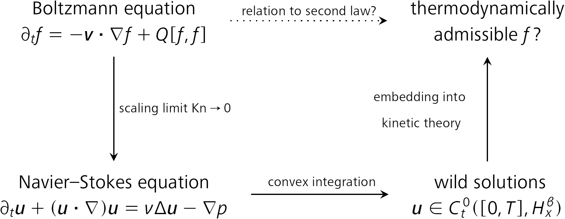 The previously raised question can thus be reformulated as: How do wild solutions of the Navier–Stokes equations relate to solutions of the Boltzmann equation? We know from the iterative structure of convex integration that these solutions involve extreme oscillations at very fine spatial scales [11 T. Buckmaster and V. Vicol, Convex integration constructions in hydrodynamics. Bull. Amer. Math. Soc. (N.S.) 58, 1–44 (2021) ]. However, at any finite Knudsen number, the hydrodynamic description is constrained by a critical wave number beyond which the Navier–Stokes model may break down [32 F. Kogelbauer and I. Karlin, Rigorous hydrodynamics from linear Boltzmann equations and viscosity-capillarity balance. Phys. Rev. E 110, article no. 055105 (2024) ].