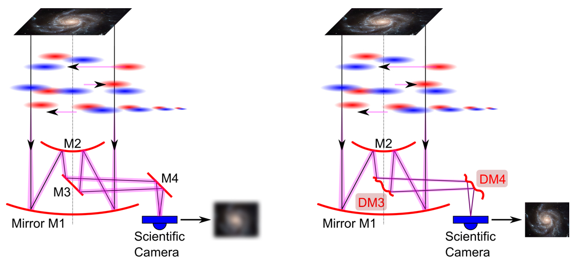 The “Transfer Group” is involved in several research projects with industry as well as other branches of science, with the goal of developing state of the art mathematical methods for applications. The group has a very tight collaboration with the “Inverse Problems and Imaging Group” within the special research program (SFB) Tomography across the Scales, which is formed by a group of researchers from mathematics, physics, astronomy and medical engineering. The Transfer Group has been particularly active in the field of Adaptive Optics (AO). AO was initially invented for the correction of degraded images from astronomical images, caused by turbulences in the atmosphere above earth-bound telescopes. To this end, incoming wavefront data from reference guide stars is measured by a wavefront sensor, and the reconstructed wavefront is used to compute an appropriate shape of deformable mirrors that are employed to correct the science images of the telescope (Figure 6). The whole correction process involves a series of mathematical tasks, e.g., modeling, analyzing and simulation of wavefront sensor devices, stable reconstruction of wavefronts from measured data [11 V. Hutterer, R. Ramlau and I. Shatokhina, Real-time adaptive optics with pyramid wavefront sensors: part I. A theoretical analysis of the pyramid sensor model. Inverse Problems35, 045007 (2019) ], reconstruction of the turbulence distribution above the telescope, optimal control of the correction of the deformable mirrors and computation of the overall Point Spread function of the observation. All the computations involved in this process must be done in real time, as the atmosphere changes every few milliseconds. RICAM is a partner of the European consortia developing the instruments METIS and MICADO [5 R. Davies, J. Alves, R. Ramlau, R. Wagner, V. Hutterer, J. Niebsch et al., The MICADO first light imager for the ELT: overview, operation, simulation. In Proceedings of the SPIE Astronomical Telescopes and Instrumentation Conference, Vol. 10702 (Austin, Texas, June 2018): Ground-based and Airborne Instrumentation for Astronomy VII, edited by C. J. Evans, L. Simard and H. Takami, SPIE, 570–581 (2018) ] for the Extremely Large Telescope of the European Southern Observatory (ESO), focusing on developing methods and software for its AO systems.
