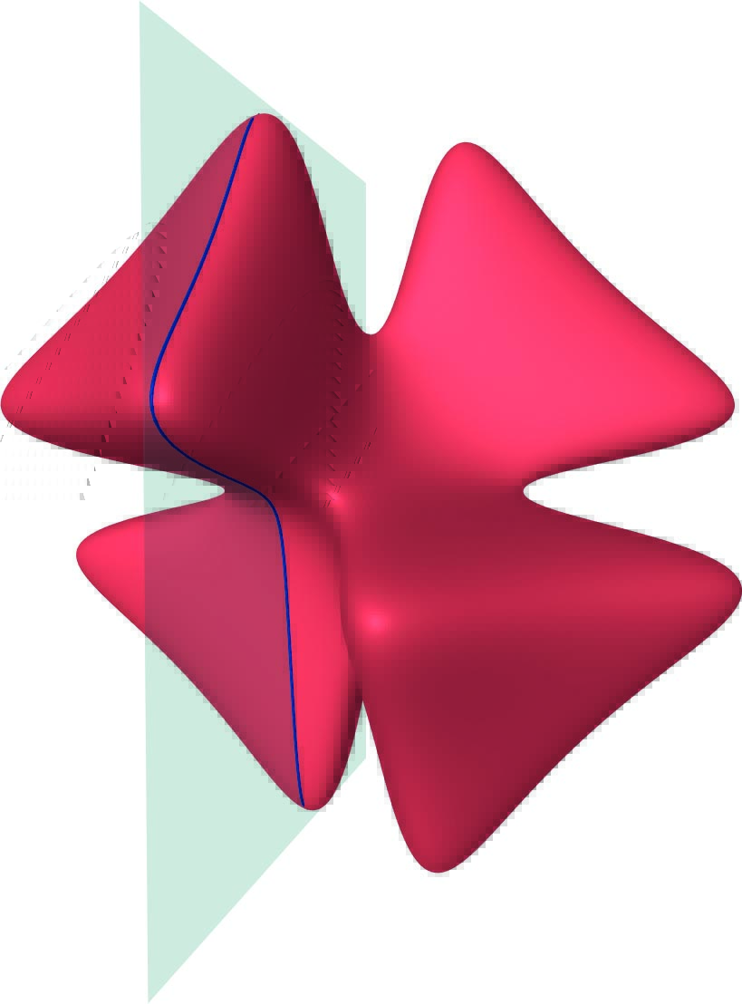 The -form is nowhere-vanishing on and is computed via a residue construction (take the residue of along ). It is interesting to consider both the complex and the real solutions of this equation, denoted and respectively. See Figure 1 for an example of real solutions. Algebraic curves (i.e., Riemann surfaces), such as those described in (1), have only finite automorphism groups as soon as the genus is at least two, but algebraic surfaces such as the one in (2) have dynamically interesting automorphisms such as