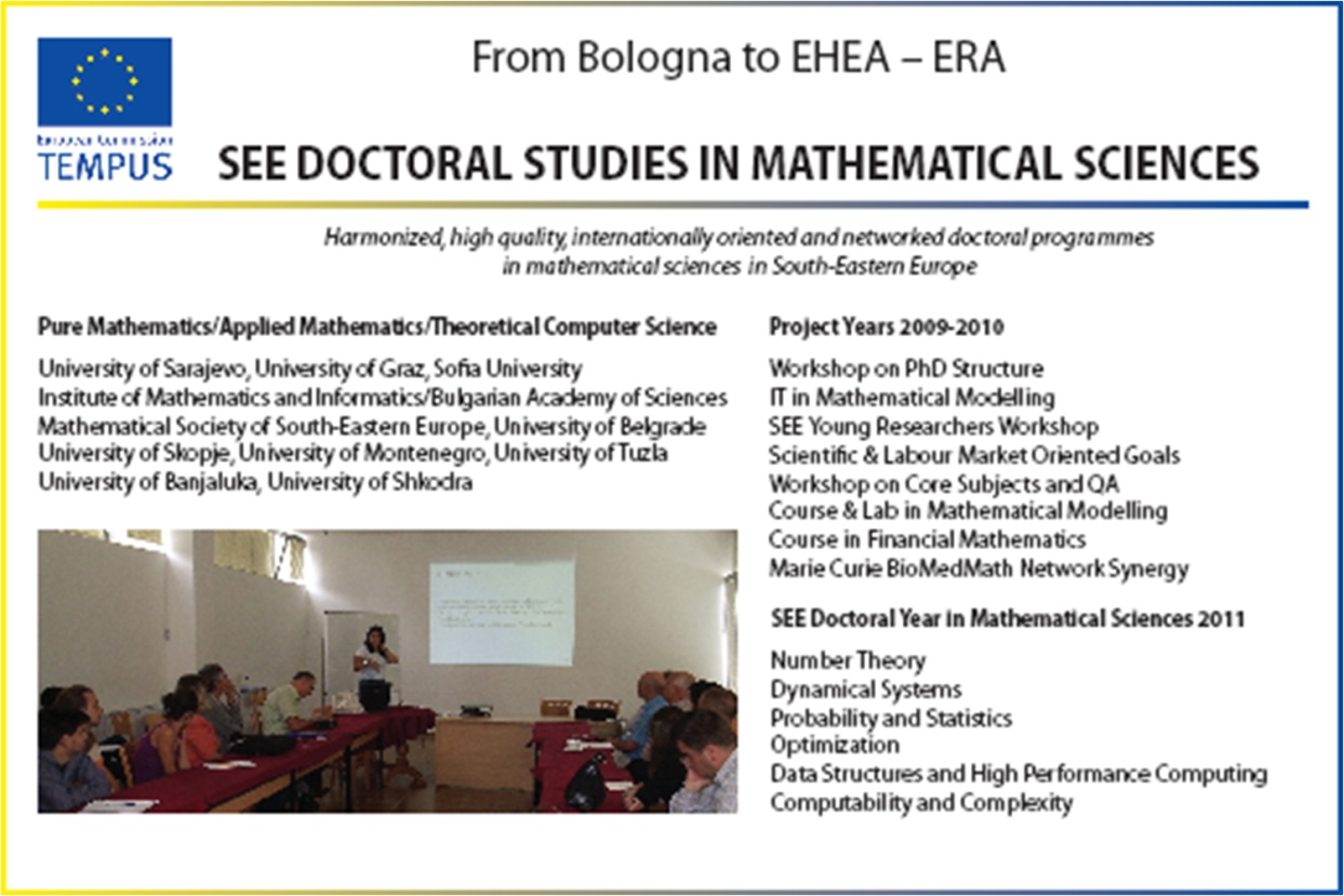 BMS was also a founding member of the MASSEE (Mathematical Society of South Eastern Europe) in 2003. An initiative of a BMS representative at the annual MASSEE meeting in 2008 resulted in a three years TEMPUS JEP Doctoral Studies in Mathematical Sciences in South East Europe coordinated by University of Sarajevo and involving a consortium of 11 institutions from five West Balkan and three EU countries. The efforts invested towards harmonized networking programmes up to EHEA-ERA standards are well represented by six joint Ph.D. courses held during 2011 – the Year of Mathematics in South East Europe (cf. also two special issues of Mathematica Balkanica in 2010 and 2011 consisting of contributions from SEE Young Researchers Workshops).