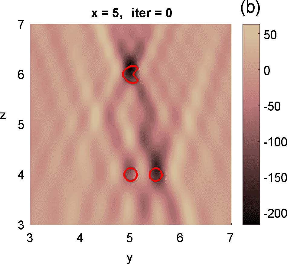 Let us revisit the example studied in Figures 3 and 4. At step 4 of the IRGN method the cost stagnates without fulfilling the stopping criteria. We calculate the topological derivative (6) of the cost for the current approximation of the objects, illustrated in Figure 3 (e). A new region where the topological derivative attains large negative values appears. We create a new object there and update the parametrization, see panel (f). Then we apply the IRGN method again. Since the cost functional still stagnates without fulfilling the stopping criteria, we recalculate the topological derivative (6) for the available object approximation. Panel (g) suggests the creation of a third object. We update the IRGN method using this new configuration, and evolve the resulting object configuration, represented in panel (h), until the stopping criterion is met at panel (i) after 24 steps. Panel (j) illustrates stagnation and decrease of the cost as new objects are added to the parametrization using topological information and the updated IRGN method evolves, in a logarithmic scale. These simulations assume known and fixed. Once first guesses for are available, we can implement this procedure considering constant values for at each component of the parametrization. Obtaining first guesses for that are reliable enough is a hard task [7 A. Carpio, T. G. Dimiduk, V. Selgas and P. Vidal, Optimization methods for in-line holography. SIAM J. Imaging Sci. 11, 923–956 (2018) ] and the optimization procedure can encounter difficulties. Bayesian approaches provide alternative procedures that can handle these difficulties while quantifying uncertainty associated to noise and missing information.